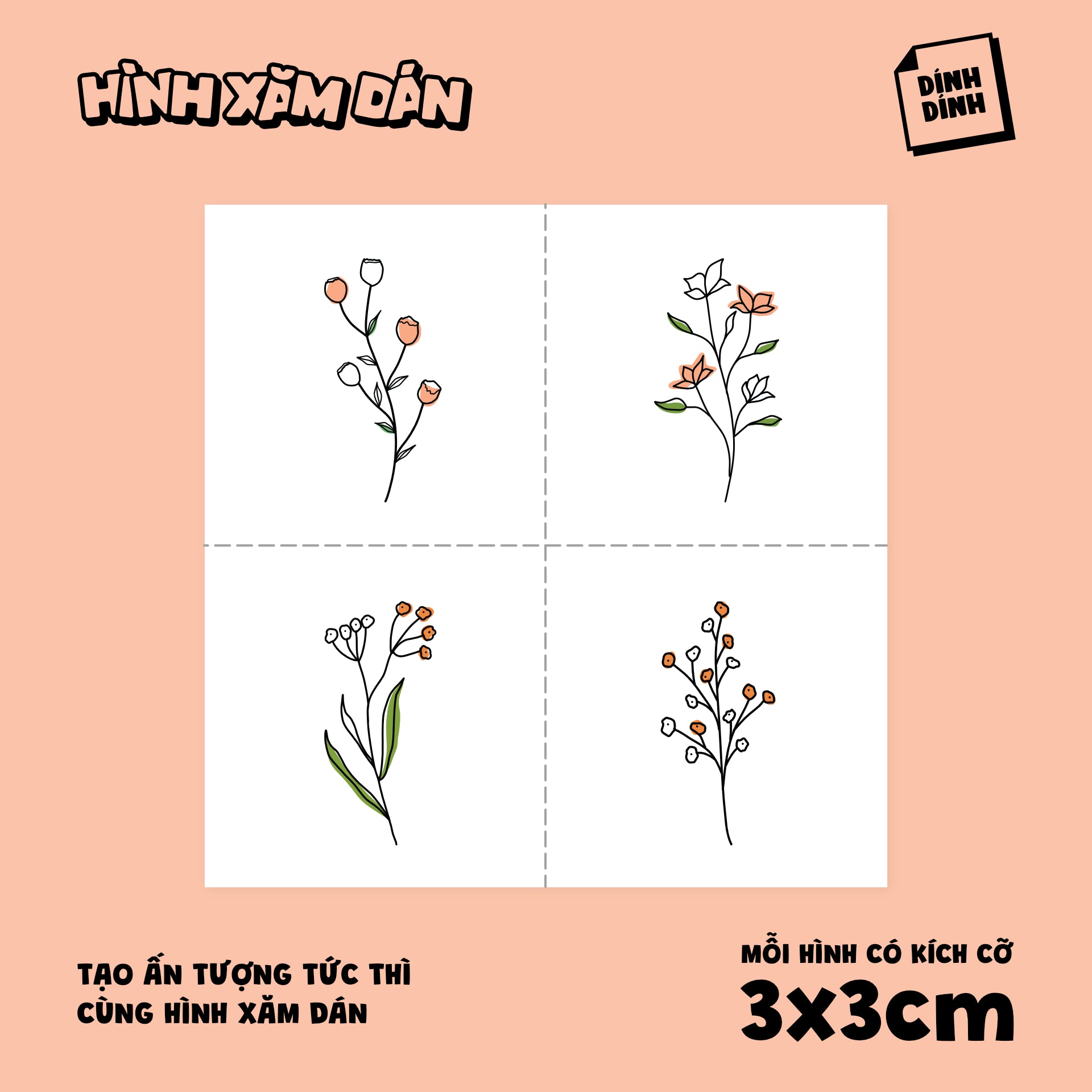 Gồm 4 hình xăm. Kích cỡ mỗi hình trong khoảng 3x3cm.