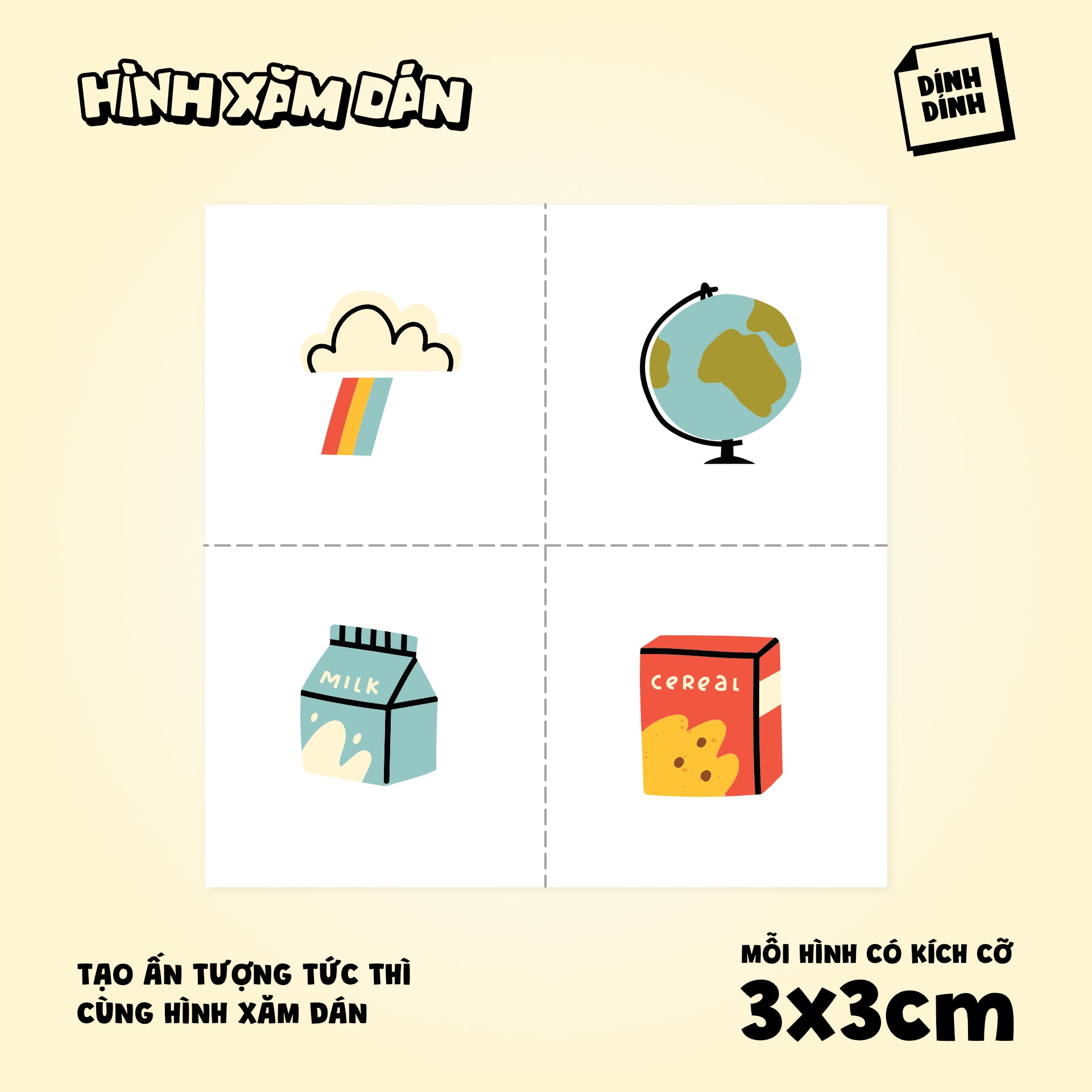 Gồm 4 hình xăm. Kích cỡ mỗi hình trong khoảng 3x3cm.