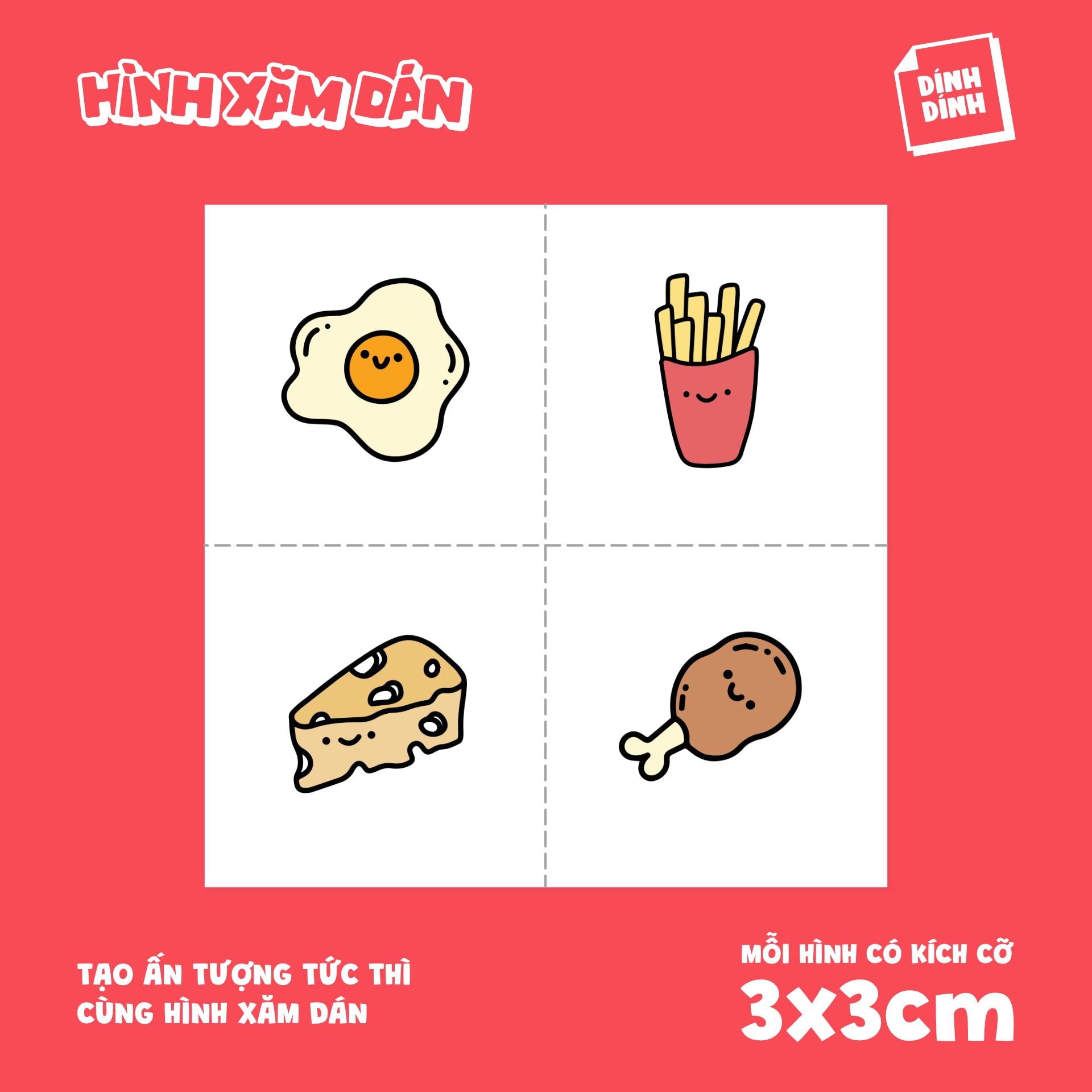 Gồm 4 hình xăm. Kích cỡ mỗi hình trong khoảng 3x3cm.