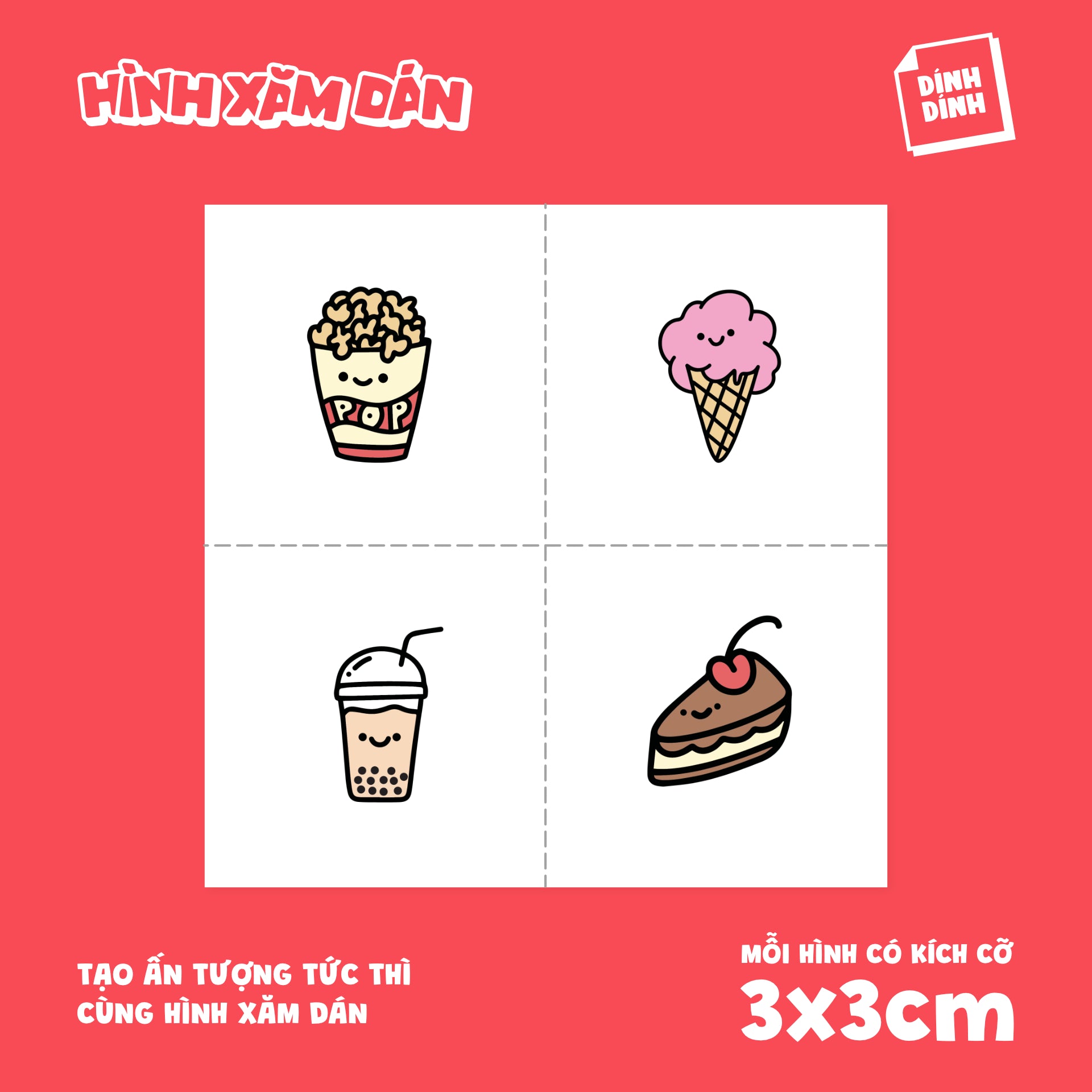 Gồm 4 hình xăm. Kích cỡ mỗi hình trong khoảng 3x3cm.