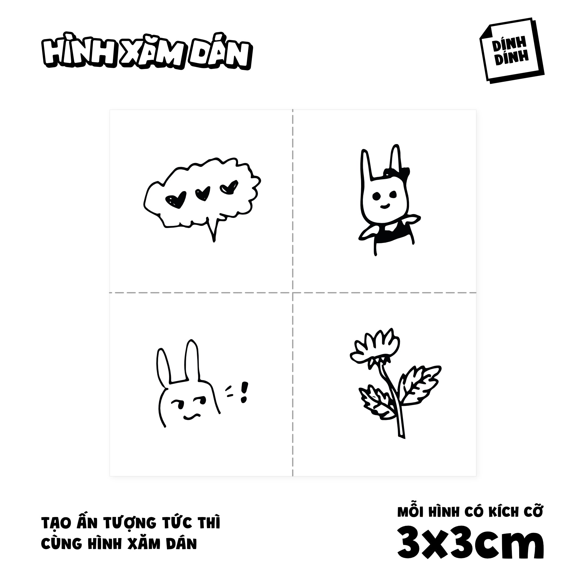 Gồm 4 hình xăm. Kích cỡ mỗi hình trong khoảng 3x3cm.