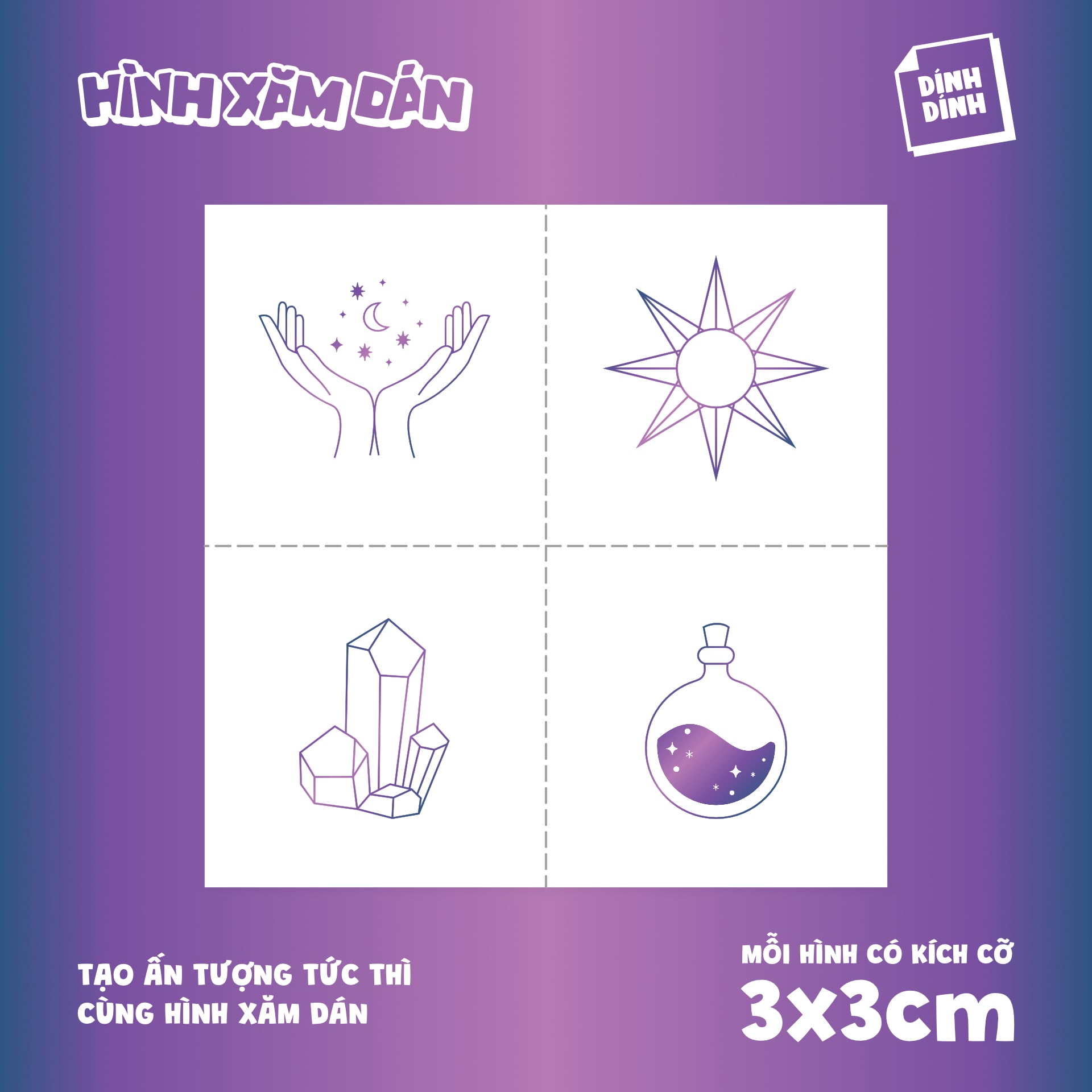 Gồm 4 hình xăm. Kích cỡ mỗi hình trong khoảng 3x3cm.